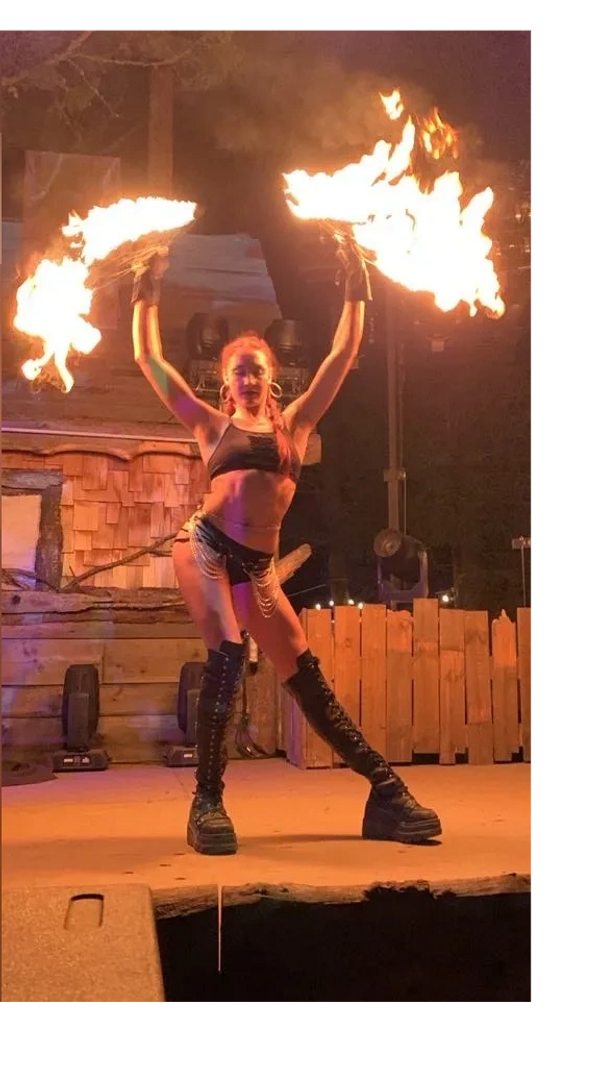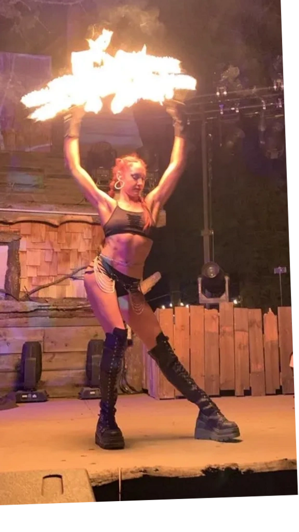 Audrey is an electrifying fire dancer, mesmerizing audiences with her mastery of flame and movement. Her performances combine precision, grace, and daring, creating a captivating fusion of dance and fire.